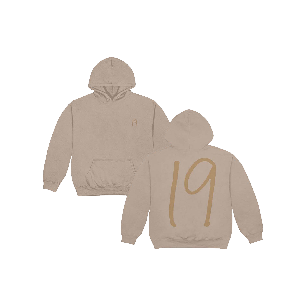 Tan pullover hoodie with '19' printed on the front left chest and a large '19' printed on the back.