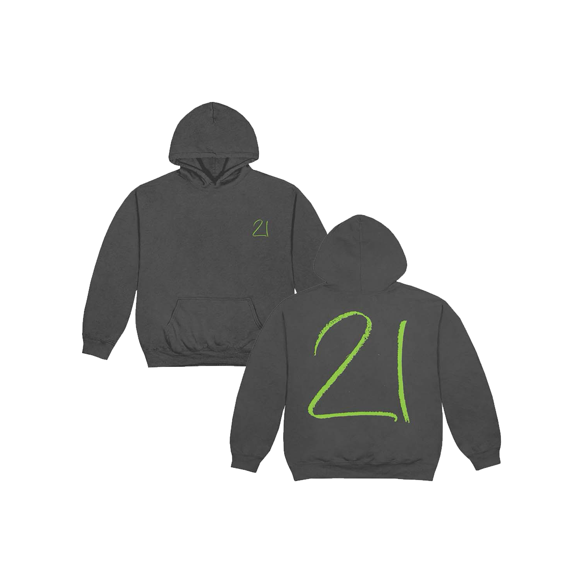 Grey pullover hoodie with '21' printed on the front left chest and a large '21' printed on the back.