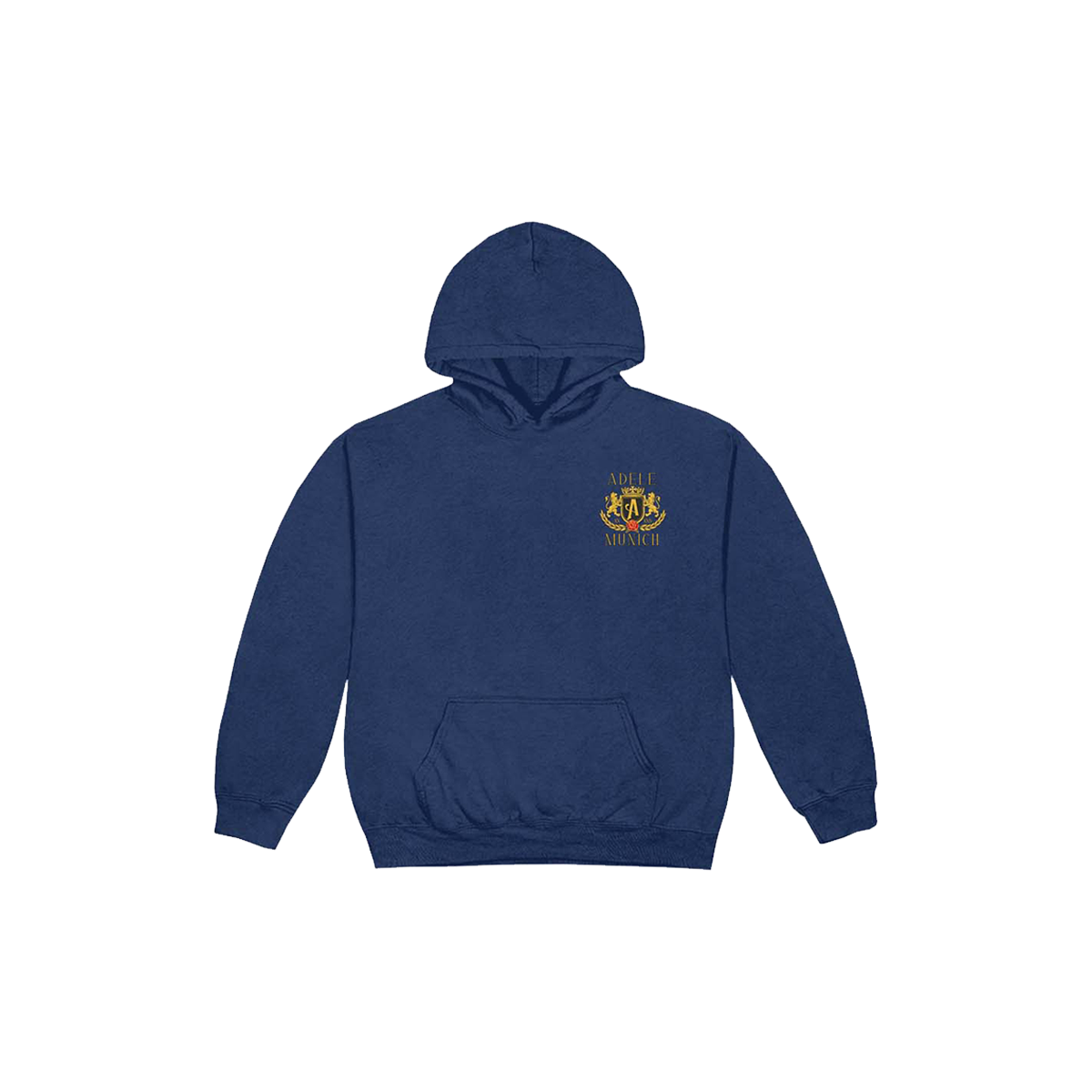 Navy pullover hoodie with 'Adele in Munich' badge printed on the front left chest.