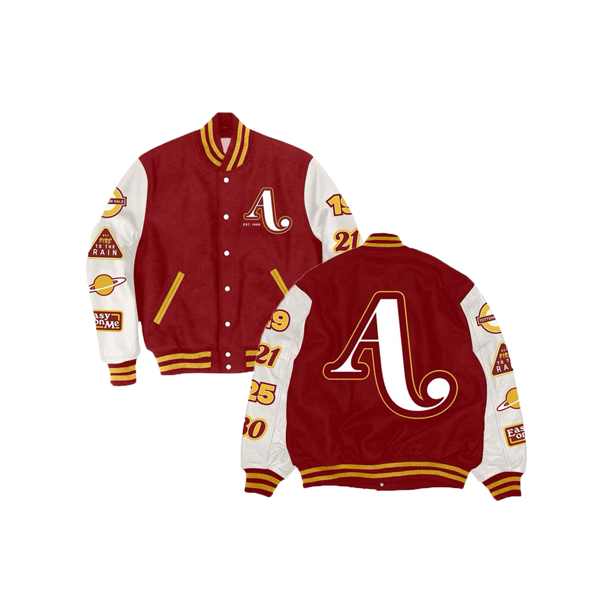 Featured at the Adele In Munich shows, a red letterman jacket featuring leather sleeves, wool body, quilt lining and snap button closures. Unisex fit.